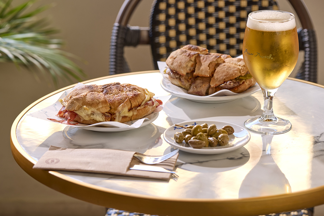 Die Bar Bosch, die sich direkt unter dem Hotel befindet, ist viel mehr als nur ein Restaurant: Sie ist seit 1936 eine Institution in Palma. Die runden Marmortische und die große, belebte Terrasse sind Teil der Alltagslandschaft im Herzen der Stadt.